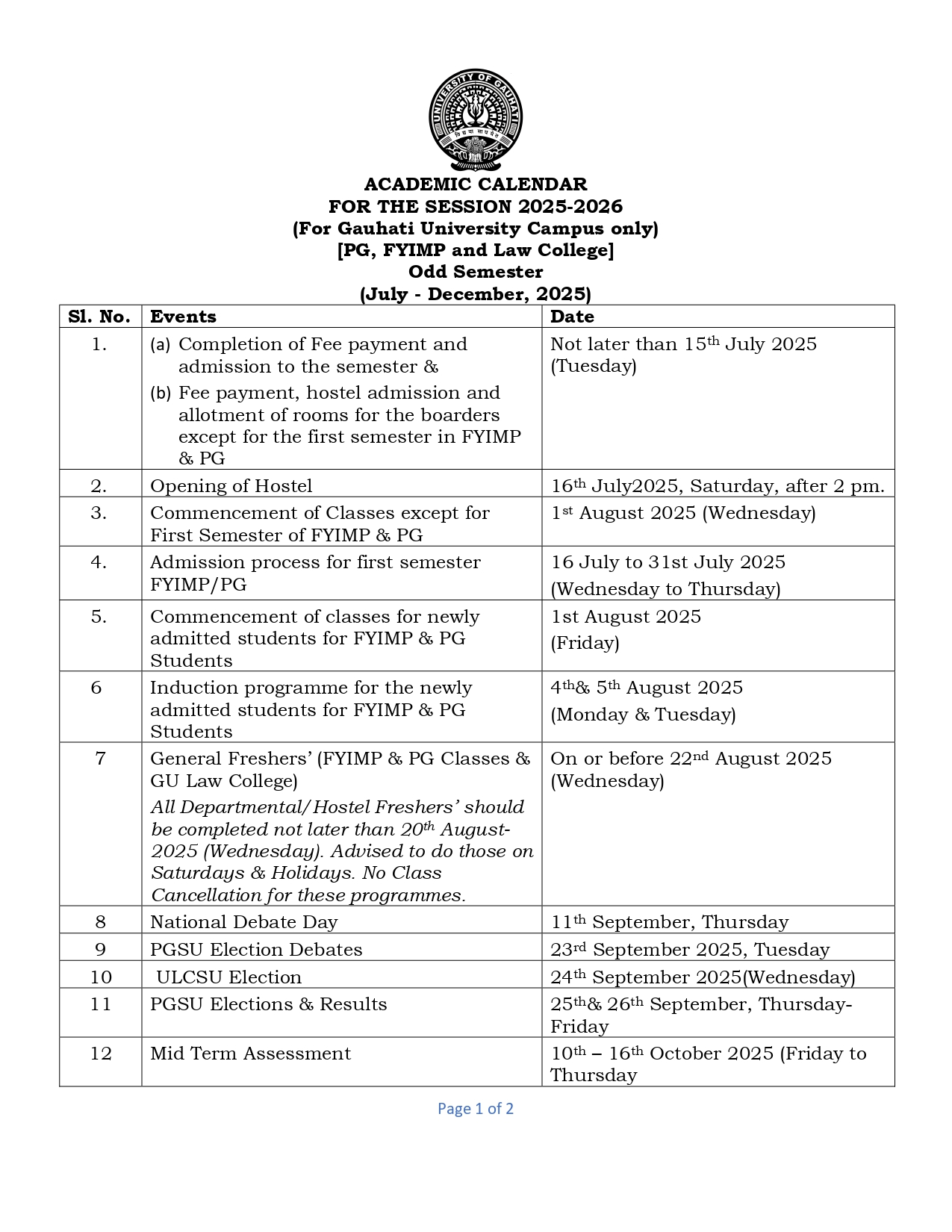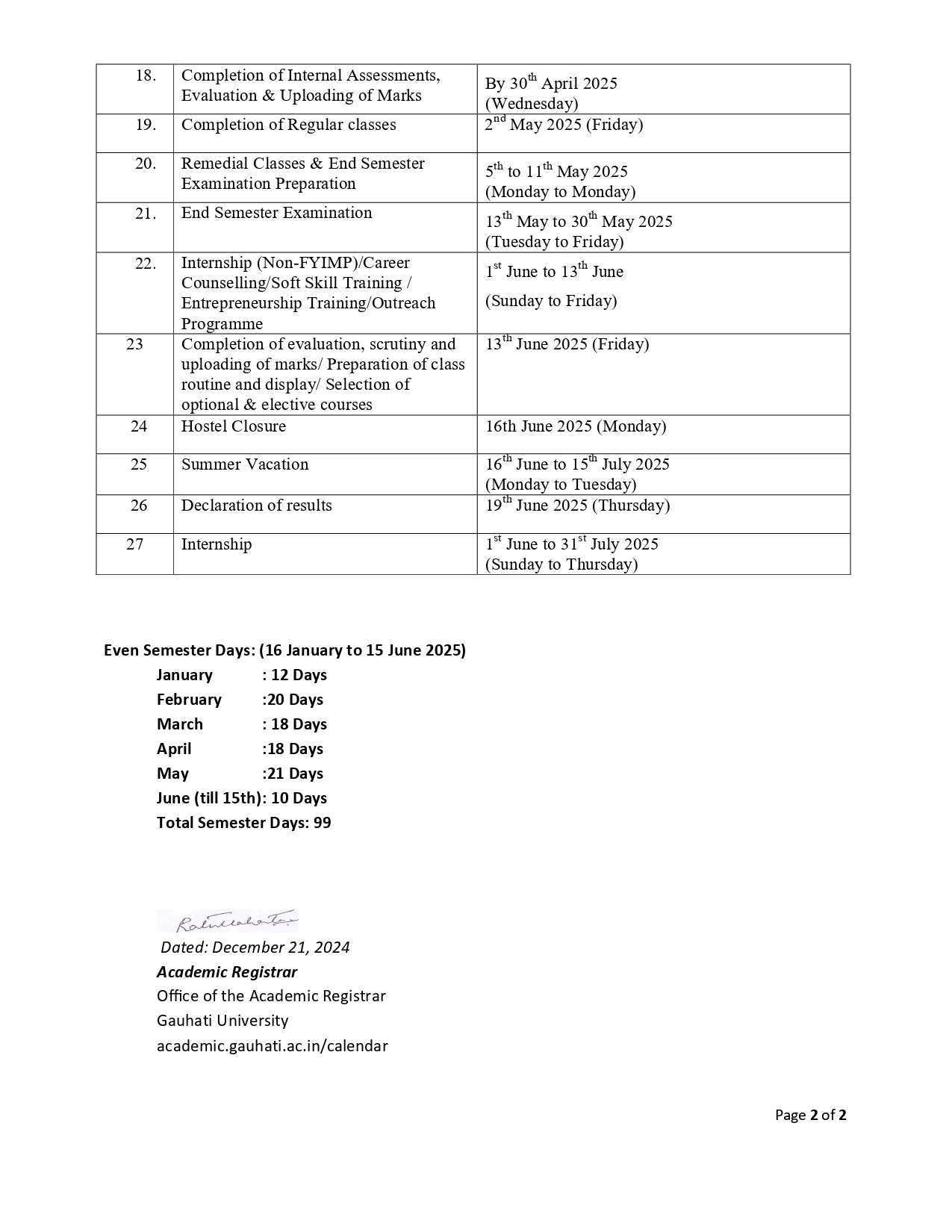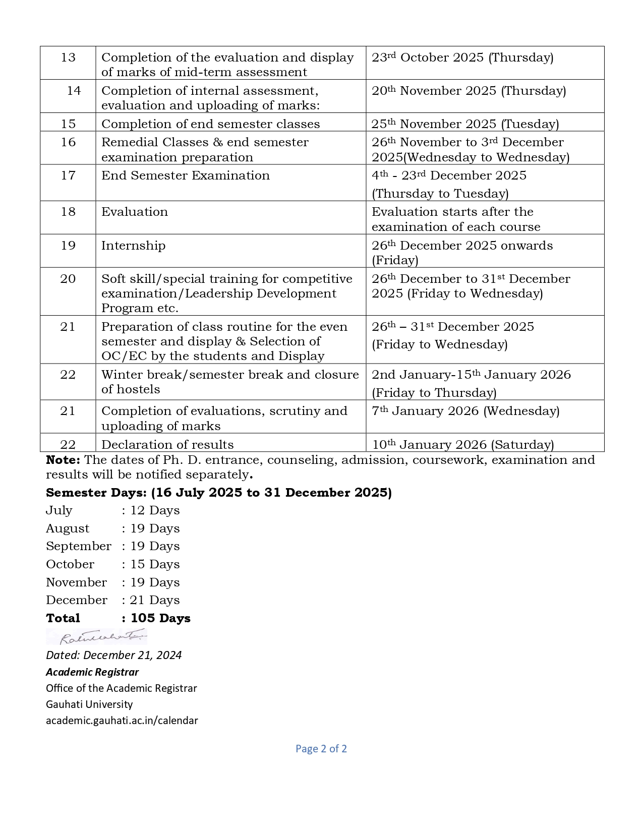 Detailed academic calendar for the semester/year.